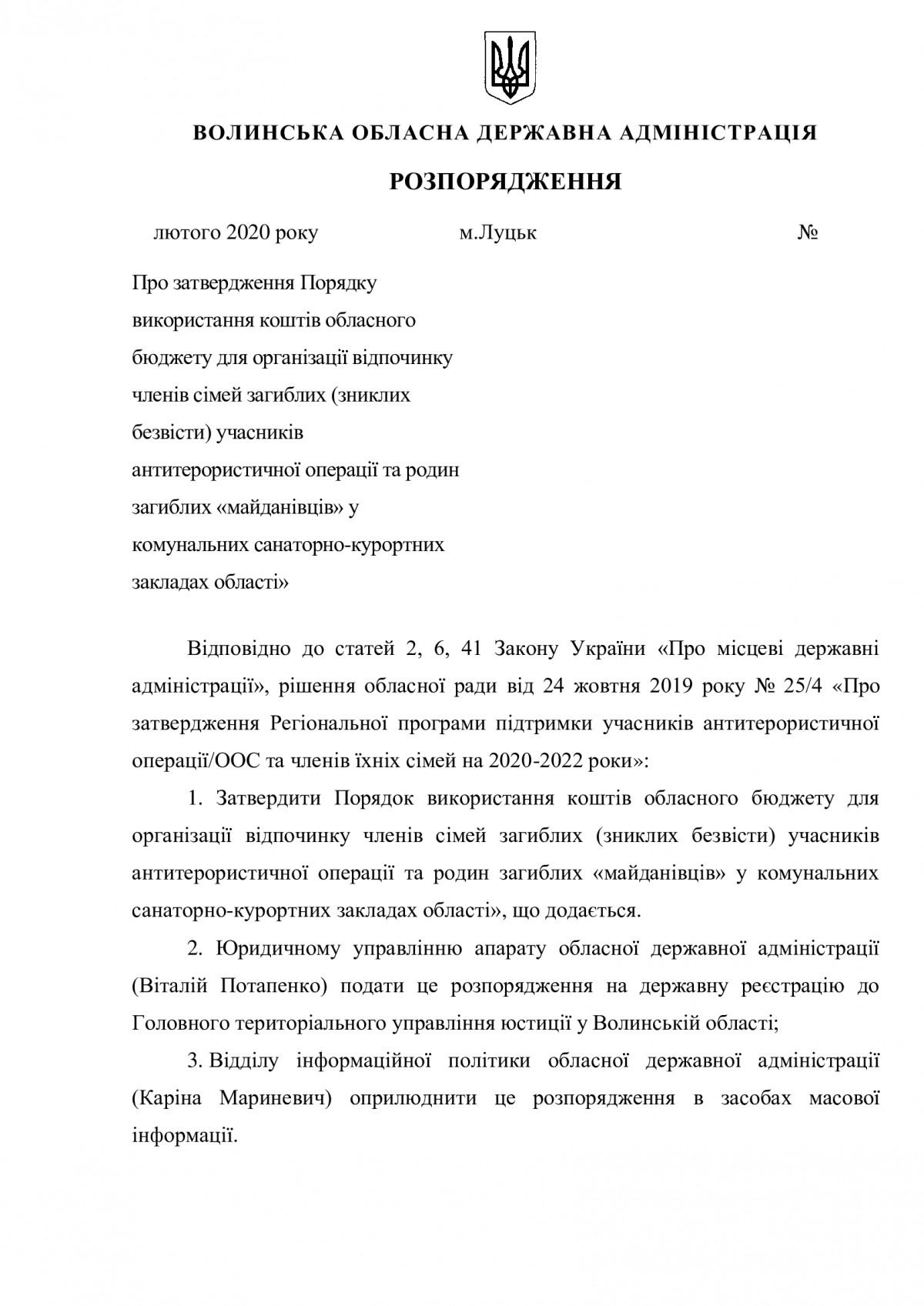 Проєкт розпорядження Про затвердження Порядку використання коштів обласного бюджету для організації відпочинку членів сімей загиблих (зниклих безвісти) учасників антитерористичної операції та родин загиблих «майданівців»