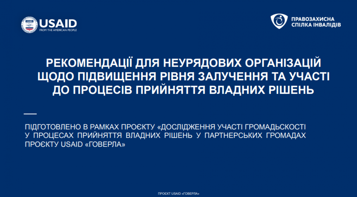 Всеукраїнська громадська організація інвалідів «Правозахисна спілка Інвалідів» (далі – Організація) реалізовує проєкт «Дослідження участі громадськості у процесах прийняття владних рішень у партнерських громадах Проєкту USAID «ГОВЕРЛА»», який став можливим завдяки Агентству США з міжнародного розвитку (USAID) та щирій підтримці американського народу через Проєкт USAID «ГОВЕРЛА».