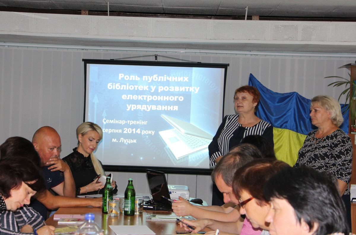 14 серпня 2019 року у Волинській державній обласній універсальній науковій бібліотеці імені Олени Пчілки відбувся семінар-тренінг з електронного урядування. Його учасниками були працівники гуманітарних відділів об’єднаних територіальних громад, бібліотек ОТГ та централізованих бібліотечних систем області.