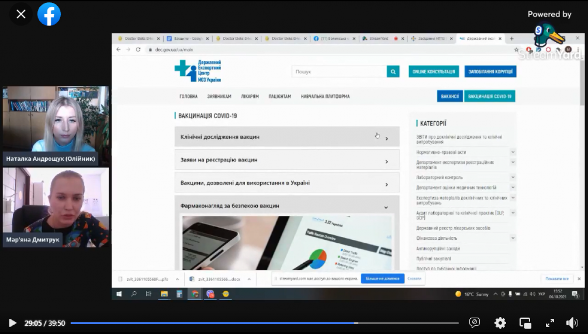 Учасників заходу лікарка ознайомила з ресурсами відкритої офіційної інформації щодо нових даних проведення щеплень та захворювань на короновірусну інфекцію на ресурсах Державного експертного центру та Центру громадського здоров'я Міністерства охорони здоров’я України.