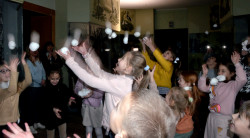На завершення свята Зима запропонувала дітям веселу зимову забаву – «сніжкову баталію». Діти отримали на згадку про музей невеликий подарунок – паперових синичок.