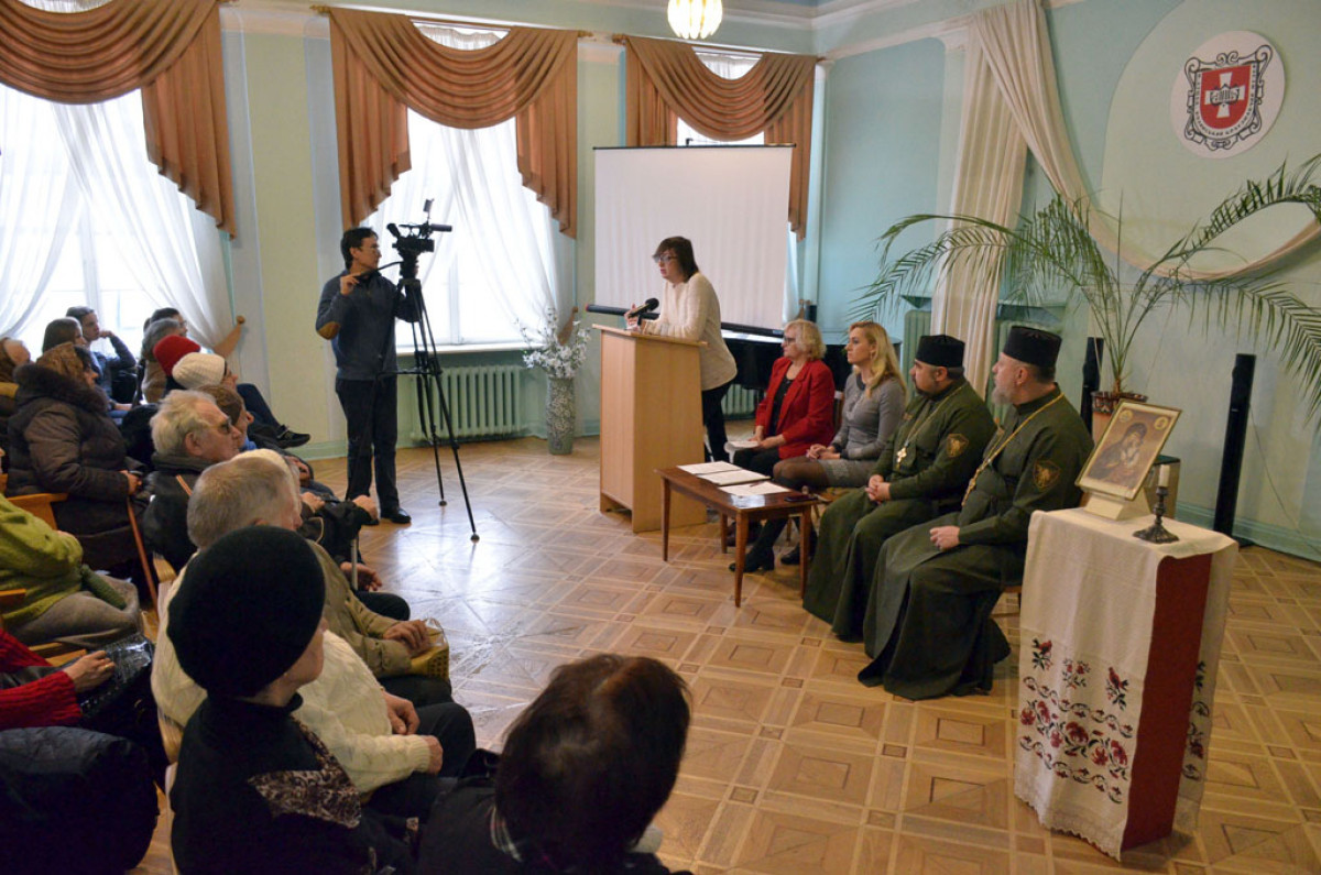 Настоятель храму Святої Покрови Пресвятої Богородиці с. Княгининок, голова ГО «Військові капелани Волині» протоієрей Михайло Бучак та настоятель храму Великомученика Пантелеймона Цілителя в с. Рованці протоієрей Сергій Коць разом з присутніми в залі членами Луцького УТОСу та учнями Центру професійно-технічної освіти молитвою вшанували пам’ять героїв Крут.