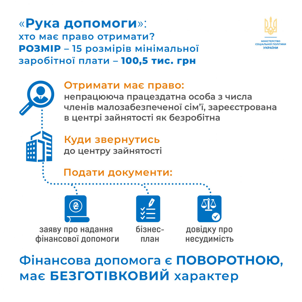 Програма дає можливість непрацюючим працездатним особам з числа членів малозабезпеченої сім’ї отримати одноразову безвідсоткову поворотну допомогу у розмірі до 100,5 тис. грн для відкриття чи розвитку власного бізнесу.