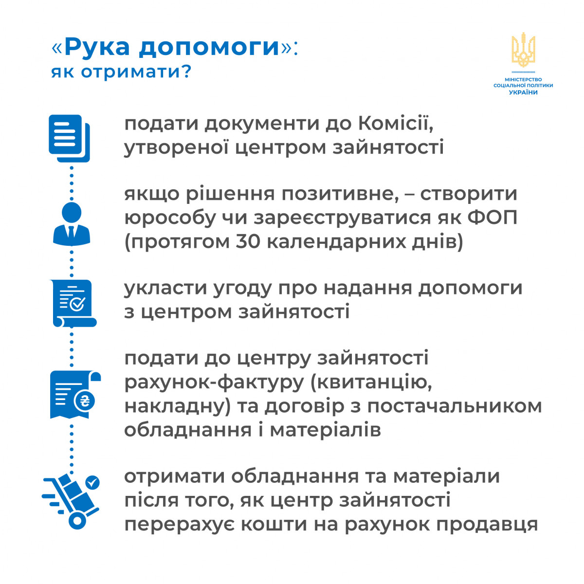 В рамках цієї політики Мінсоцполітики перезапускає програму «Рука допомоги», яка спрямована на допомогу малозабезпеченим особам у відкритті власної справи.