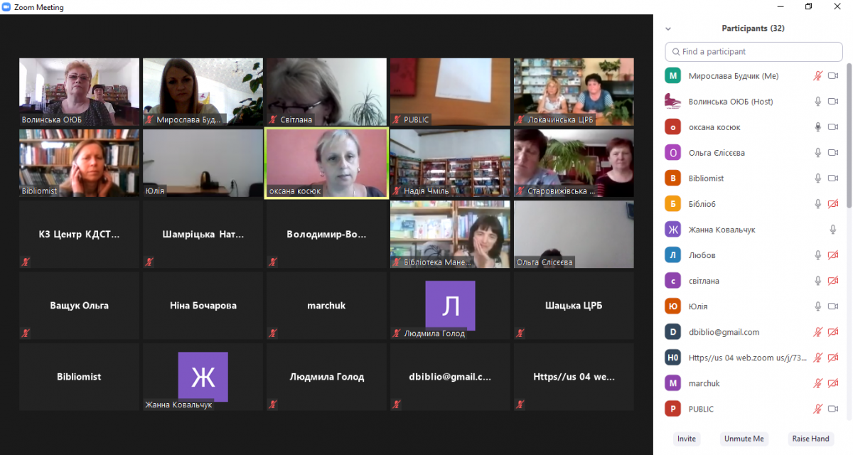01 липня 2020 року Волинська обласна бібліотека для юнацтва на платформі ZOOM провела веб обмін досвідом «Адаптивний карантин: нові умови та форми роботи з молоддю». У заході взяли участь 32 бібліотеки області.