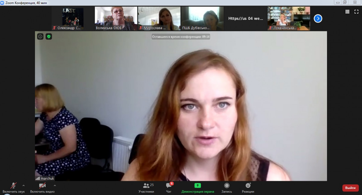 Модератор заходу, директорка Волинської обласної бібліотеки для юнацтва Алла Єфремова, поділилася досвідом роботи установи в умовах карантину, відповіла на запитання учасників спілкування. Їх цікавили умови проведеня конкурсу досліджень сакральних пам’яток «Духовні витоки Волині» серед районних (міських) централізованих бібліотечних систем та публічних бібліотек об’єднаних територіальних громад, який проводиться управлінням культури, з питань релігій та національностей Волинської обласної державної адміністрації, обласним відділенням Української бібліотечної асоціації та Волинською обласною організацією Національної спілки краєзнавців України.