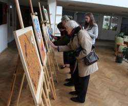 На нинішній виставці демонструється п’ять вишиваних полотен, створених нашою співвітчизницею в Італії впродовж останнього року. Показ даної міні-колекції приурочений до 04 жовтня – дня пам’яті Олени Пчілки (Ольги Петрівни Косач), ім’я якої носить наша бібліотека. Адже Ольга Петрівна, за висловом її чоловіка Петра Антоновича, була «робоча, як бджола». Дана експозиція розпочинається «медовим сюжетом» із зображенням бджоли в сотах, що співпадає з основною тональністю творчості письменниці, етнографа, Берегині української культури та духовності.