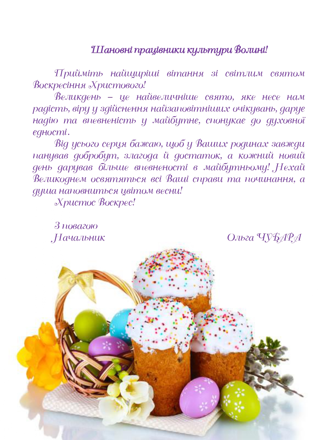 Вітання начальника управління культури, з питань релігій та національностей облдержадміністрації Ольги ЧУБАРИ з Великоднем
