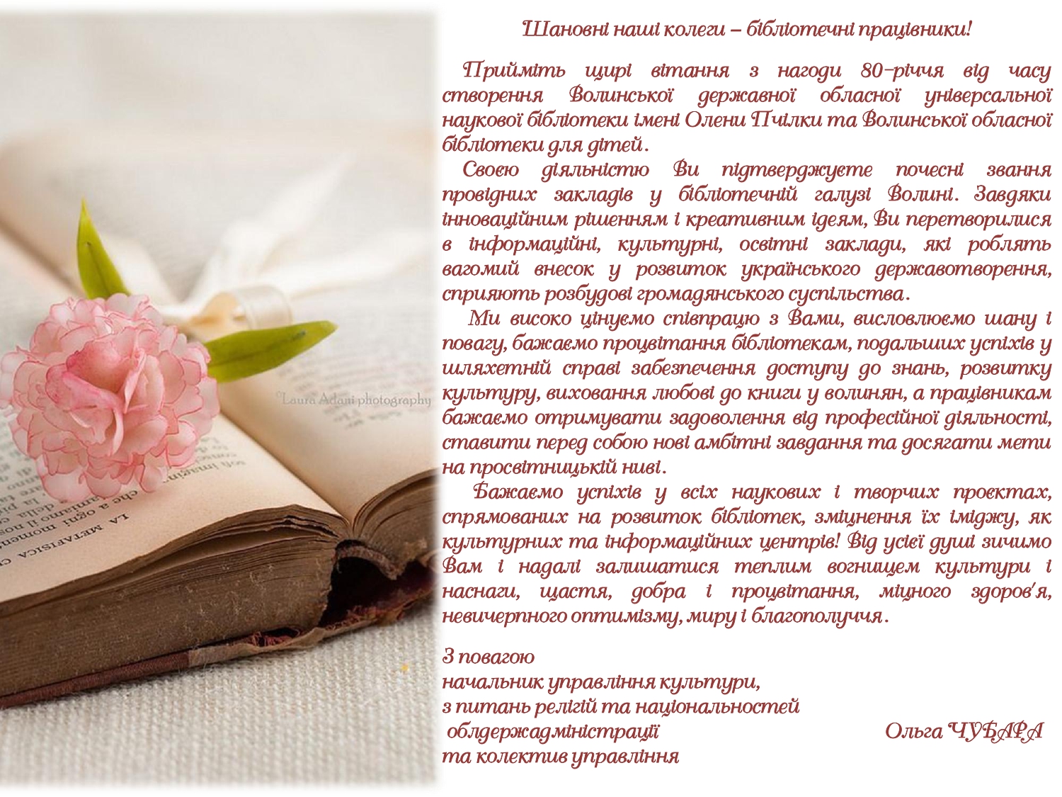 Вітання начальника управління культури, з питань релігій та національностей облдержадміністрації Ольги ЧУБАРИ з нагоди 80-річчя від часу створення Волинської державної обласної універсальної наукової бібліотеки імені Олени Пчілки та Волинської обласної бібліотеки для дітей