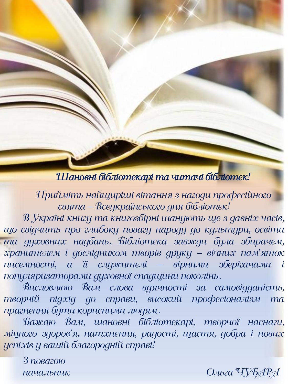 Вітання начальника управління культури, з питань релігій та національностей облдержадміністрації Ольги ЧУБАРИ з нагоди Всеукраїнського дня бібліотек!