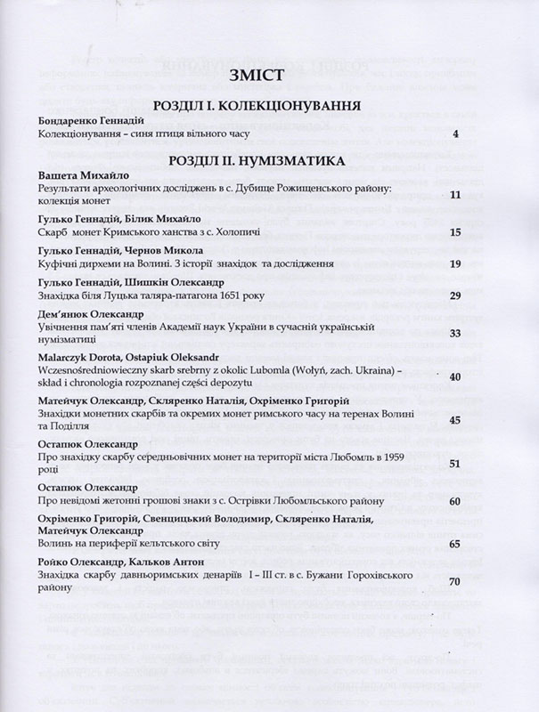 Видання здійснено громадською організацією «Товариство нумізматів Волині» і Волинською обласною організацією Національної спілки краєзнавців України. У першому числі альманаху «Волинський колекціонер» зібрано статті з колекціонування й, безпосередньо, з нумізматики. Вони присвячені проблемам нумізматики та грошового обігу в різні періоди цивілізаційної історії людства, в тому числі і знахідкам скарбів на території Волинського краю періоду Римської імперії, Арабського халіфату, Кримського ханства тощо, а також статті, в яких піднімаються наукові проблеми, над якими працюють вітчизняні науковці сьогодні.