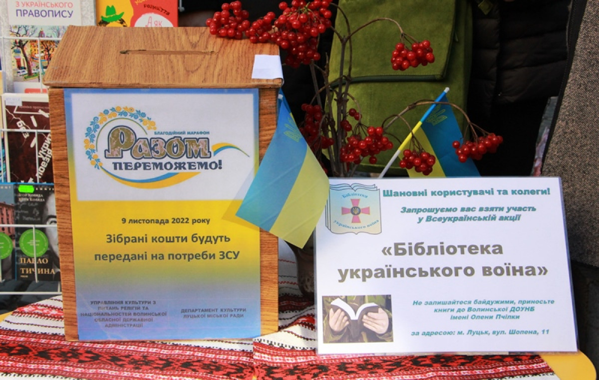 Волинська обласна книгозбірня імені Олени Пчілки взяла участь у благодійному марафоні «Разом переможемо», який було організовано управлінням культури, з питань релігій та національностей Волинської облдержадміністрації та департаментом культури Луцької міської ради.