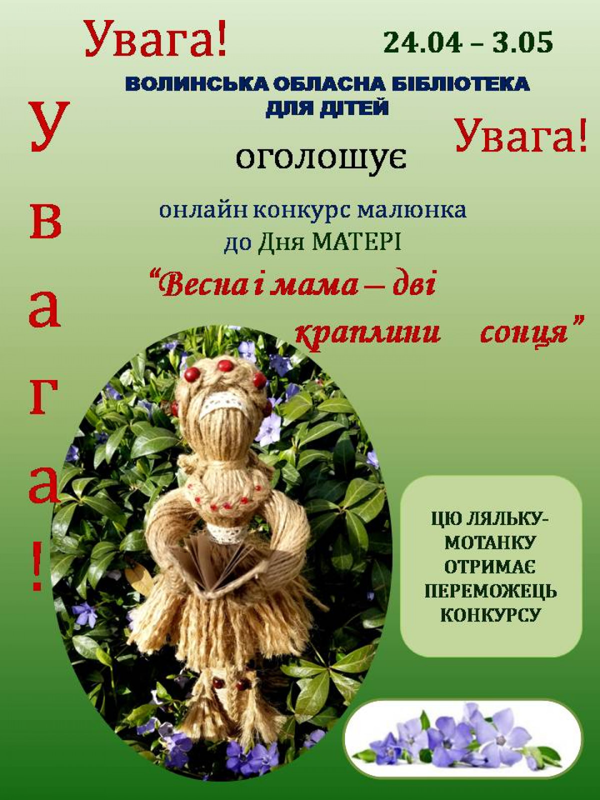 10 травня Україна відзначає День Матері. Волинська обласна бібліотека для дітей пропонує усім бажаючим, і дорослим і дітям, взяти участь у онлайн - конкурсі малюнка, присвяченому Дню Матері під назвою «Весна і Мама – дві краплини сонця»