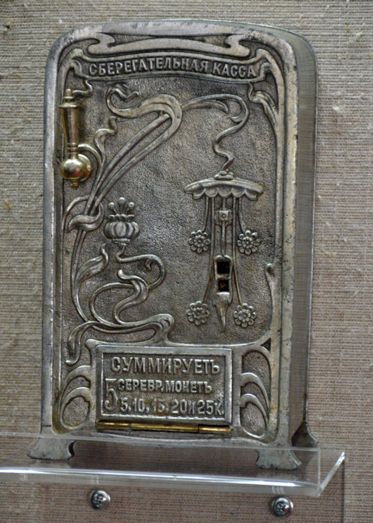 Для переховування скарбів у землі найчастіше використовували керамічний посуд. У новітні часи найбільш надійні скарбнички виготовляли на початку ХХ століття на Варшавській метало-ливарній фабриці «Труд», яка належала Російській імперії. Вони називалися ощадними касами («Сберегательная касса»). Для кожного власника така скарбничка була свого роду міні-банком. Наша скарбничка – сейф датована 1903 роком.