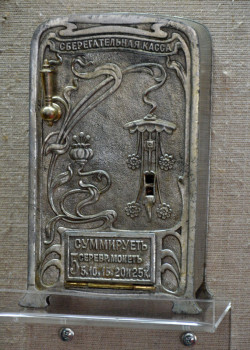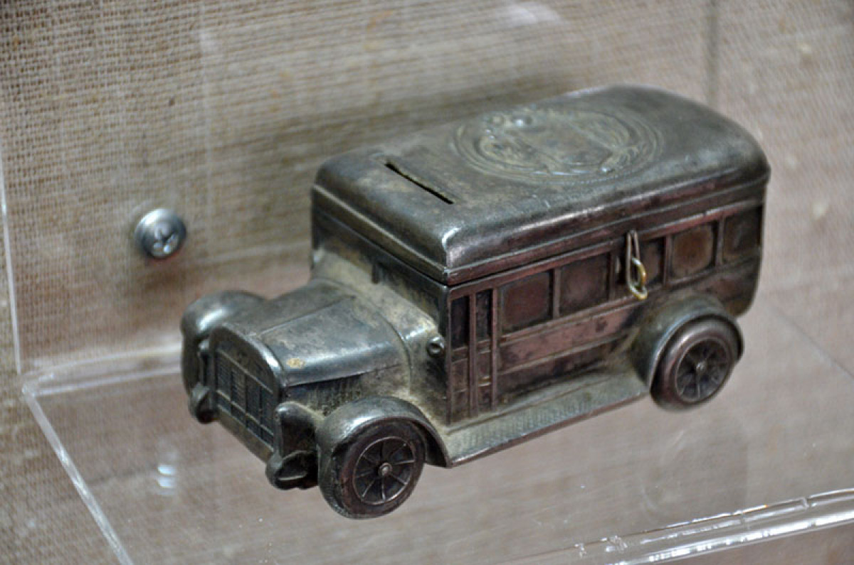 Ливарним способом виготовлено на початку ХХ ст. і невелику скарбничку-сувенір у вигляді автомобіля: данина технічному прогресу. Ймовірно, він призначався не для монет, а для прикрас: резервуар для схову досить невеличкий.