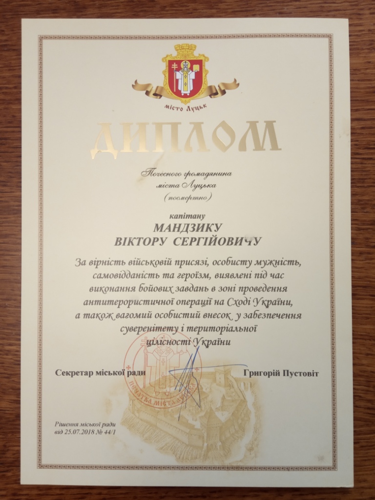 Рішення міської ради Луцька від 25 липня 2018 р. капітану Мандзику Віктору Сергійовичу посмертно присвоєно звання Почесного громадянина Луцька.