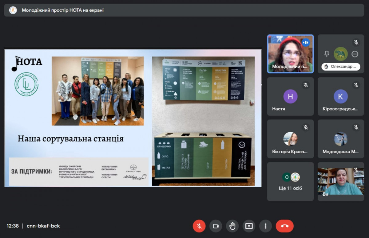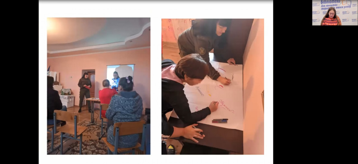 діяльності в межах проєктів поділилися колеги: Анастасія Чередник, головна бібліотекарка відділу популяризації книги та організації змістовного дозвілля молоді Кіровоградської обласної бібліотеки для юнацтва ім. Є. Маланюка «Екологічна культура молоді засобами анімаційної комунікації»; Вікторія Кравчина, провідна бібліотекарка відділу інформаційних технологій та електронних ресурсів Вінницької обласної бібліотеки для юнацтва «Екосвідомість: вплив бібліотеки на екологічну комунікацію»; Юлія Аркушин, бібліотекарка Луцької центральної бібліотеки для дітей «Зелений кейс бібліотеки-студії ДіМ».