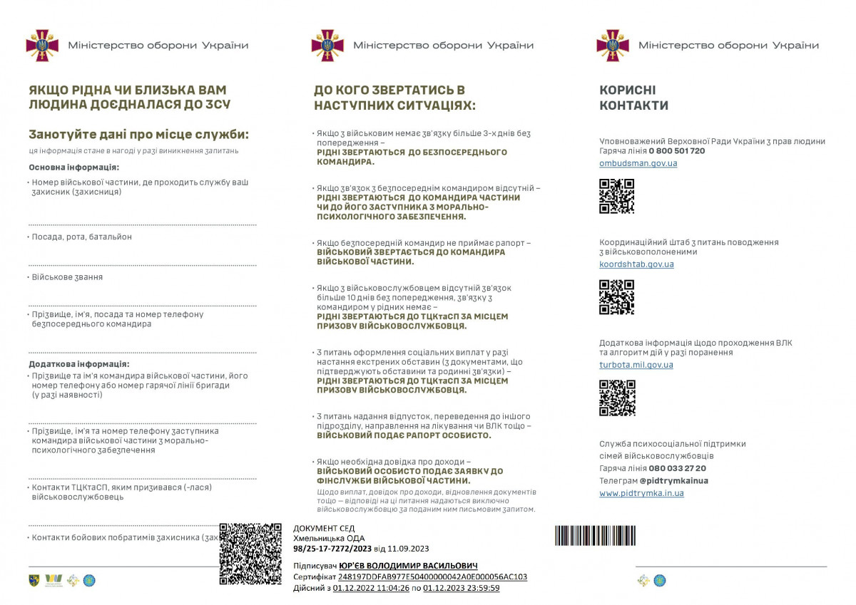 Родичі військових у буклеті можуть власноруч заповнити дані про захисників та захисниць, мати перелік основних контактів, за якими слід звертатися у різних ситуаціях, що можуть виникнути.