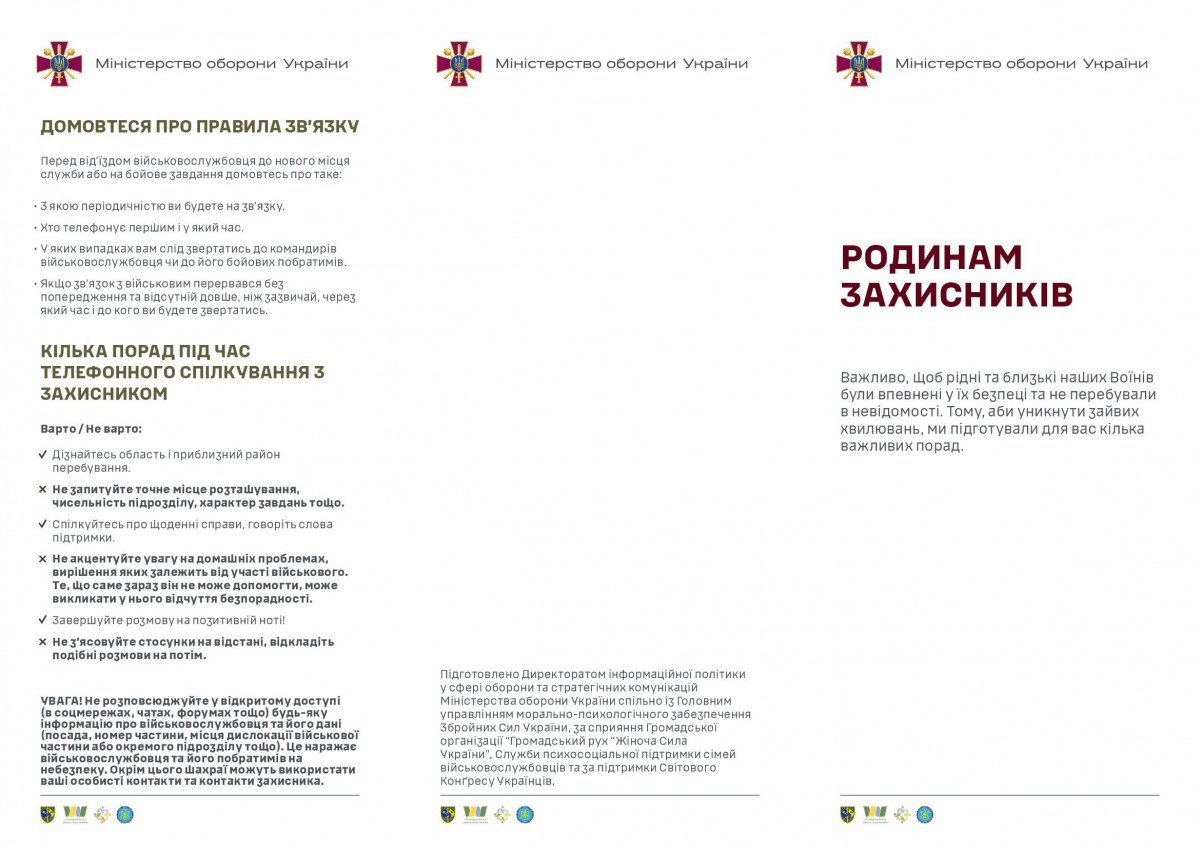 Міністерство оборони України, в рамках соціального проєкту «Родинам захисників», розробило брошури, які інформують як запобігти стресовим ситуаціям у родинах захисників і захисниць та поінформувати членів сімей військових про канали комунікації із ЗСУ.