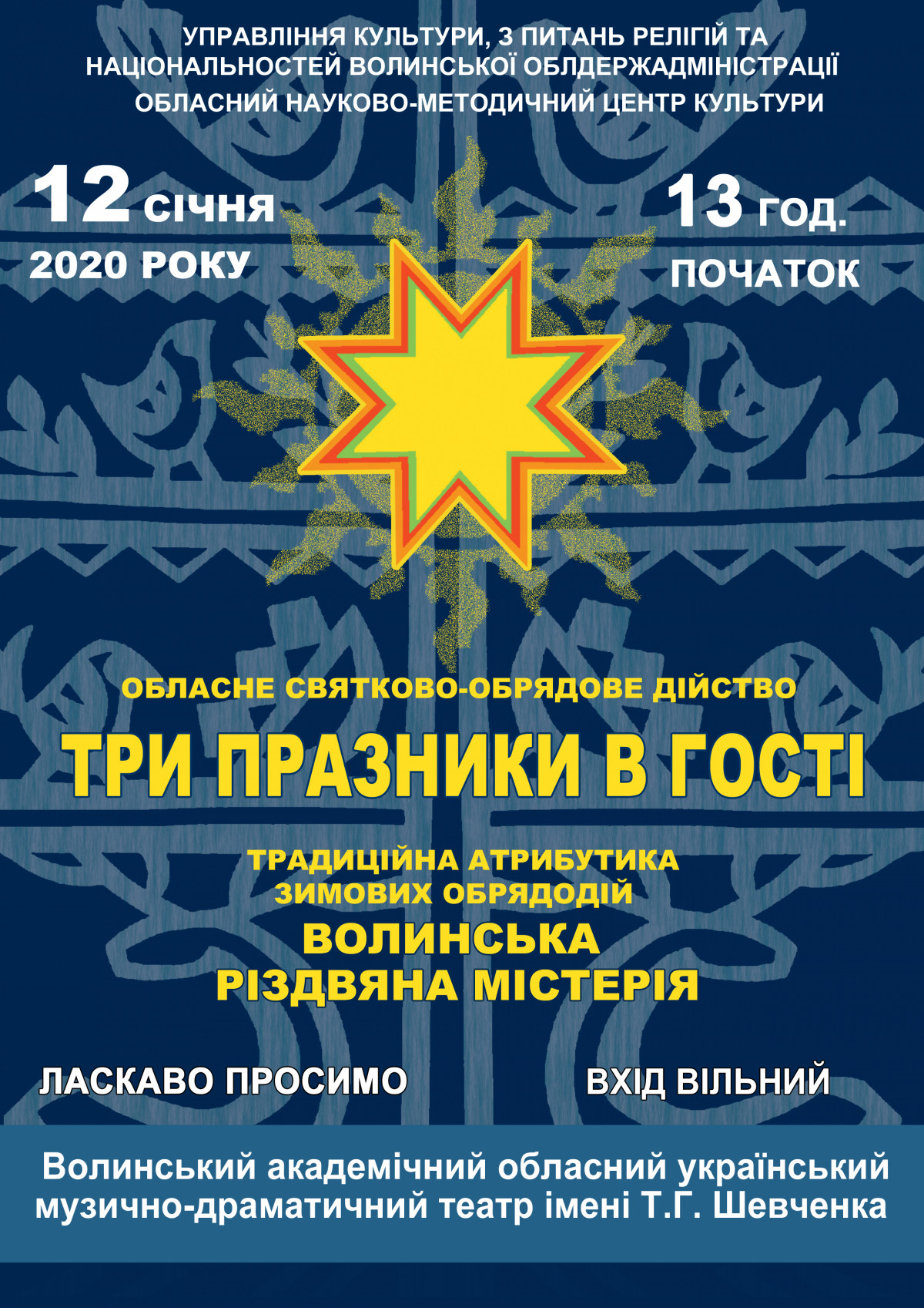 12 січня 2020 року о 13.00 годині у приміщенні Волинського академічного обласного українського музично-драматичного театру імені Тараса Шевченка відбудеться обласне святково-обрядове різдвяне дійство «Три празники в гості».