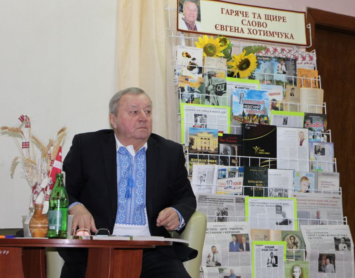05 лютого 2020 року у Волинській державній обласній універсальній науковій бібліотеці імені Олени Пчілки відбулася зустріч шанувальників із Заслуженим журналістом України, письменником, редактором газети „Вісник+К°” Євгеном Яковичем Хотимчуком. Захід, що відбувся у вщерть заповненій актовій залі книгозбірні, приурочувався до 45-річчя початку творчого шляху цього непересічного митця, нашого сучасника, на посаді кореспондента газети „Радянська Волинь”. Одночасно були презентовані чергові книги письменника – „Коли дуби плачуть”, „Калиновий щем”, „Байструк”. А всього в доробку Євгена Хотимчука – 13 книг, у написання яких він вкладає часточку душі. Персонажі новел узяті з життя, більшість із них мешкає у рідному селі Рудка-Козинська Рожищенського району. Земляки пишаються творчими успіхами Євгена Яковича. На зустріч прибула численна група односельців на чолі з сільським старостою Миколою Яцюком, а також брат ювіляра Володимир Якович із племінниками.