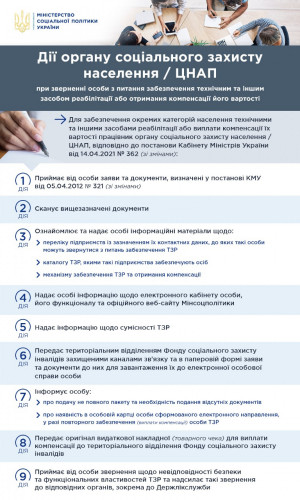 Дії органу соціального захисту населення / ЦНАП при зверненні особи з питання забезпечення технічним та іншим засобом реабілітації або отримання компенсації його вартості (інфографіка)