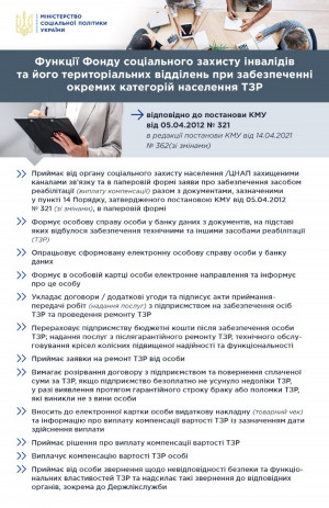 Функції Фонду соціального захисту інвалідів та його територіальних відділень при забезпеченні окремих категорій населення ТЗР або отримання компенсації їх вартості (інфографіка)