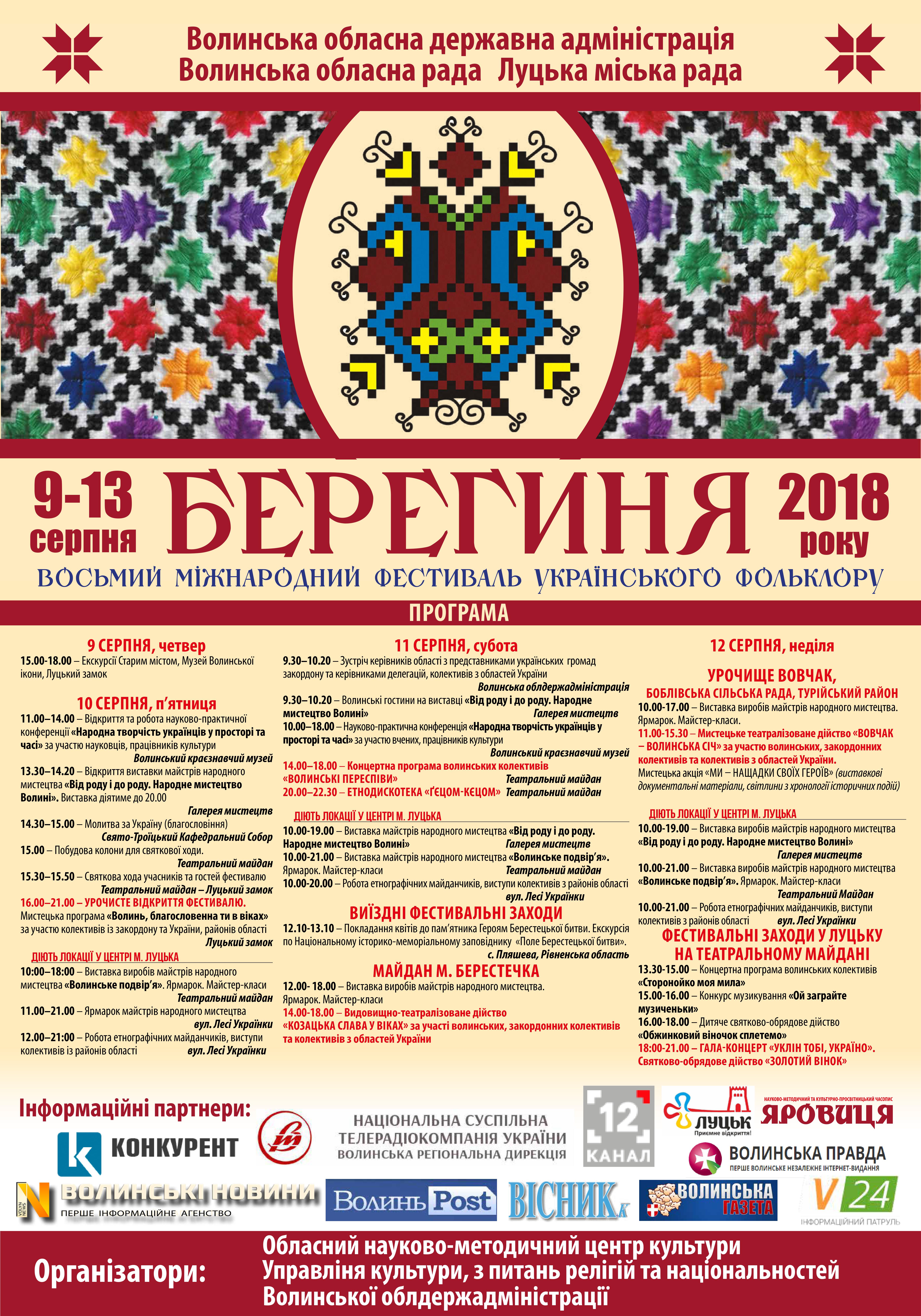 10-12 серпня 2018 року на Волині відбудеться Восьмий Міжнародний фестиваль українського фольклору «Берегиня».