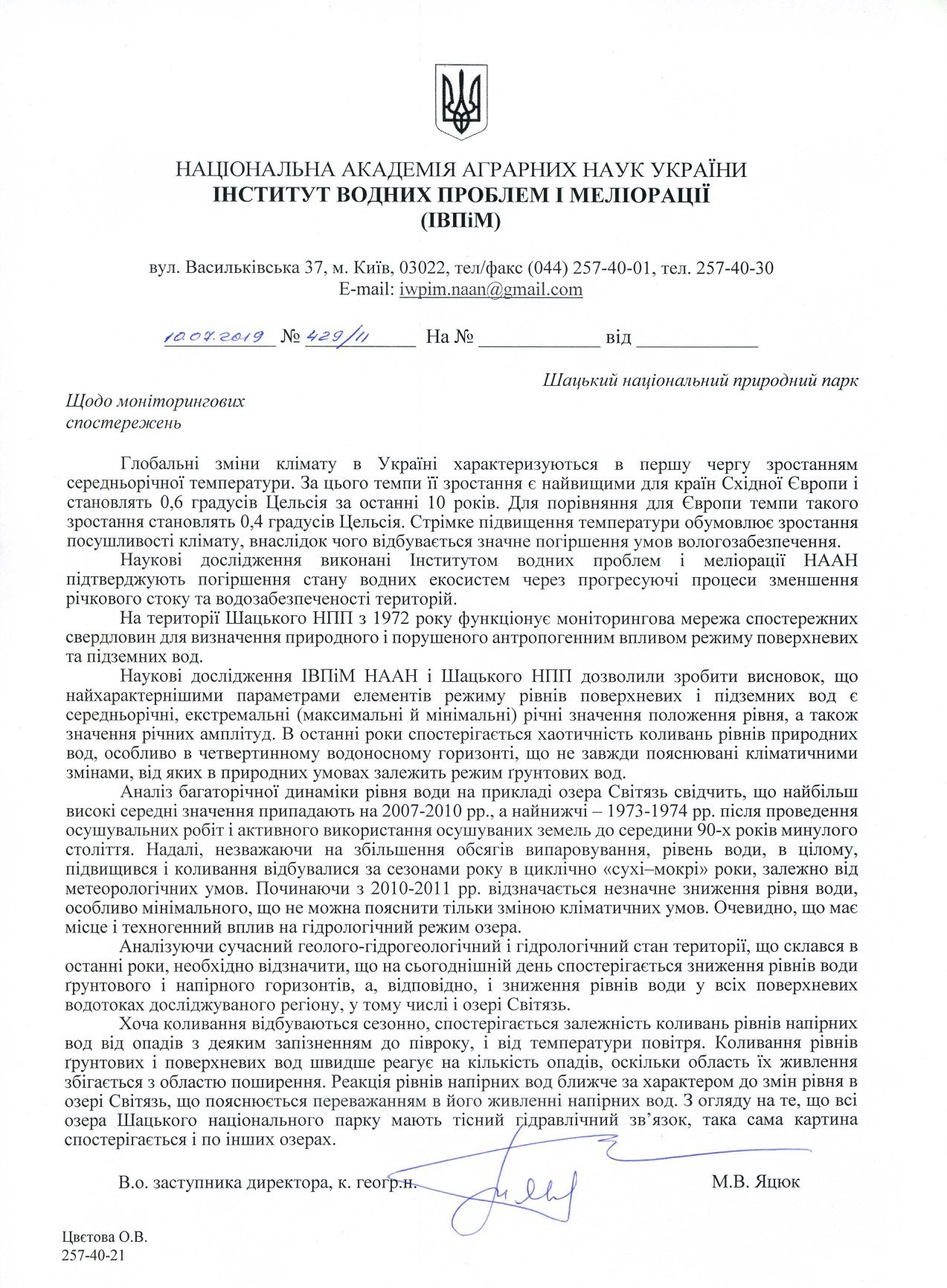 До слова, наукові дослідження, виконані Інститутом водних проблем і меліорації НААН підтверджують погіршення стану водних екосистем через прогресуючі процеси зменшення річкового стоку та водозабезпеченості територій. Адже, на території Шацького НПП з 1972 року функціонує моніторингова мережа спостережних свердловин для визначення природного і порушеного режиму поверхневих та підземних вод.