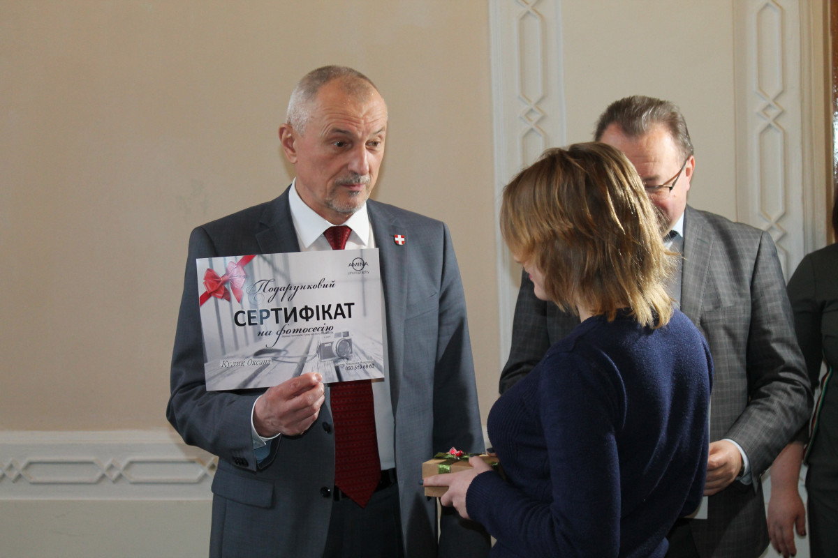 — Ми довго думали, що вам подарувати, аби життєвий старт був ще веселішим. І ми домовилися з представником соціально-відповідального бізнесу про такий презент – подарунковий сертифікат на професійну фотосесію з врученням портфоліо. Про це, напевно, мріє кожна дівчина, – зауважив Олександр Ілліч.