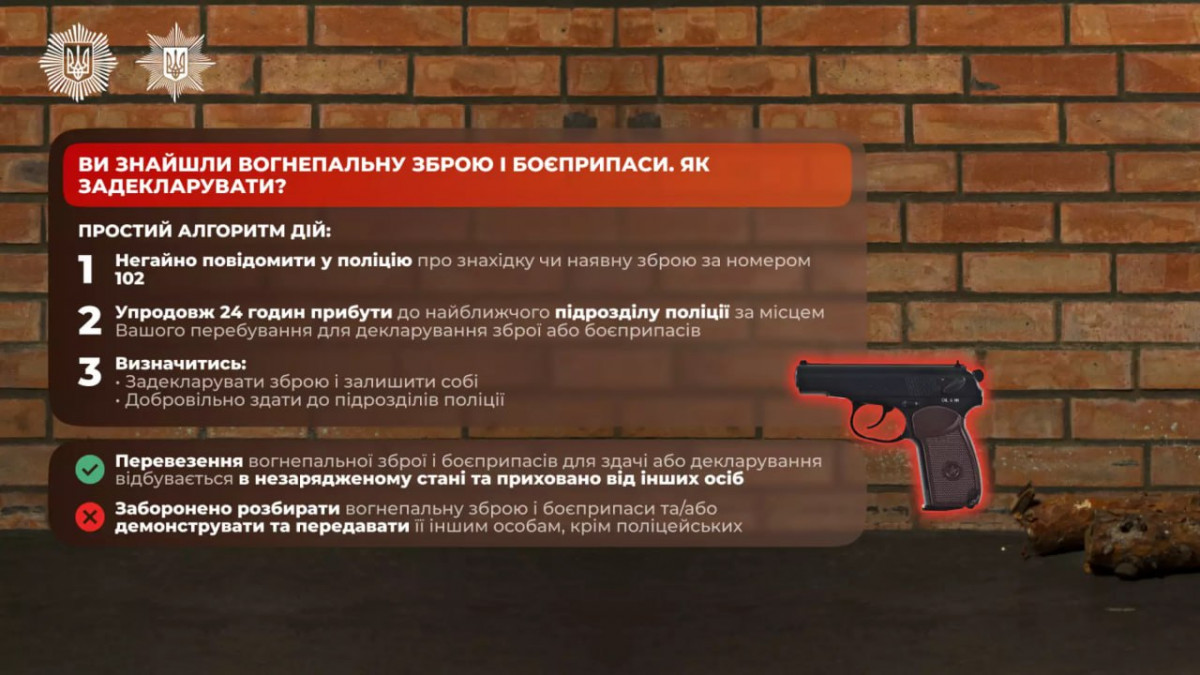 Якщо ви знайшли вогнепальну зброю та боєприпаси до неї, вам необхідно негайно їх задекларувати. Зробити це можна у підрозділах Національної поліції: