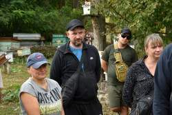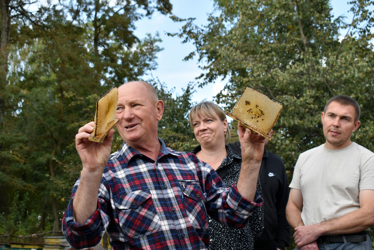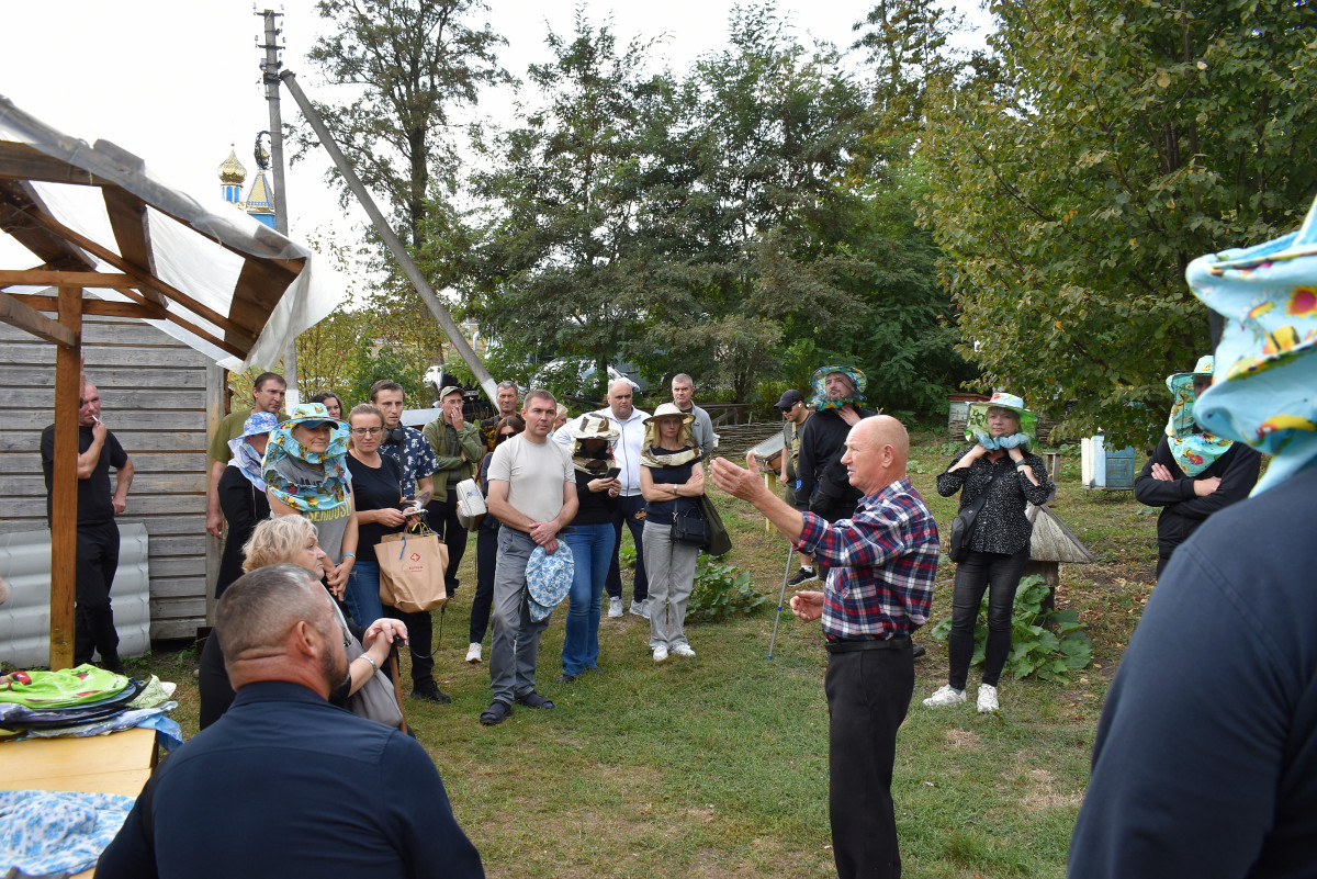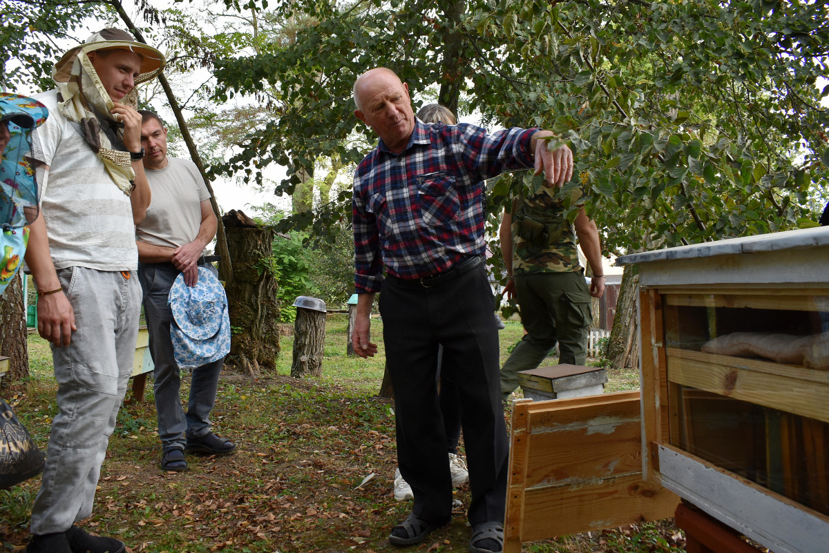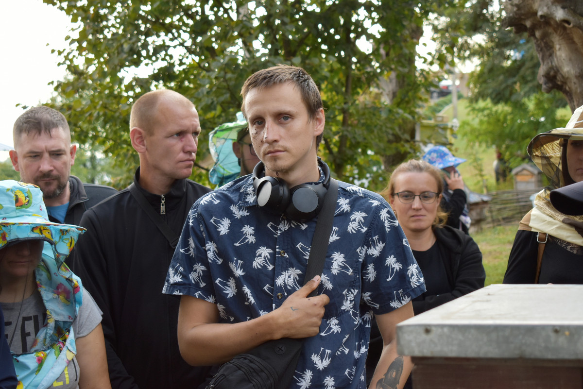 Невисокий, меткий пасічник вправно водить за собою військових та розповідає про бджіл з любов’ю і гумором: