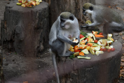 Виявляється, милі мавпочки запросто можуть з’їсти горобця чи необережного голуба, які частенько залітають у вольєр. Тож раціон у них досить різноманітний, включає м'ясо й чистий протеїн у вигляді зоофобусів.