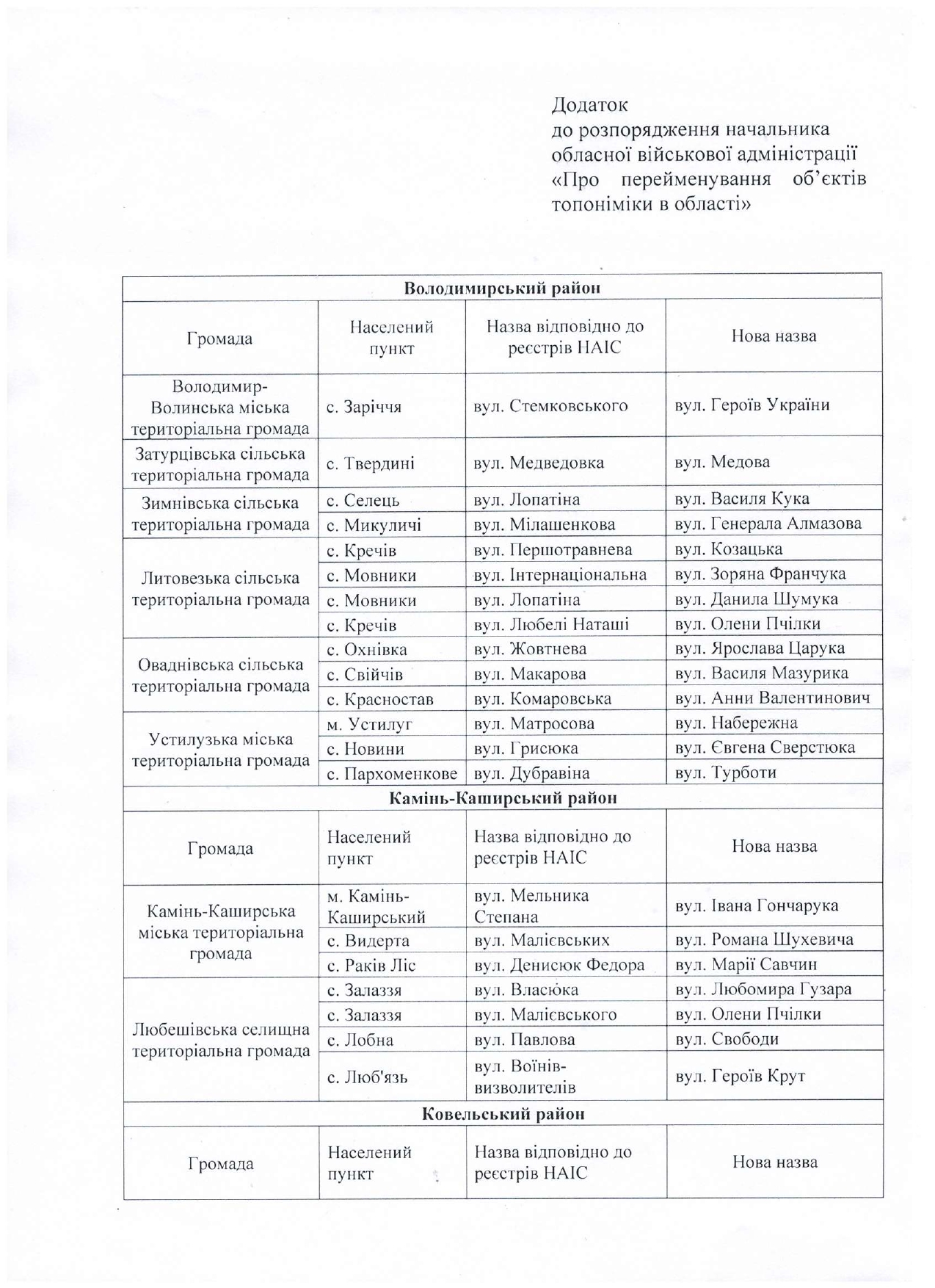 «Днями підписав розпорядження про перейменування об’єктів топоніміки Волині. Це ще один важливий крок з очищення простору від російських маркерів», - відзначив Юрій Погуляйко.