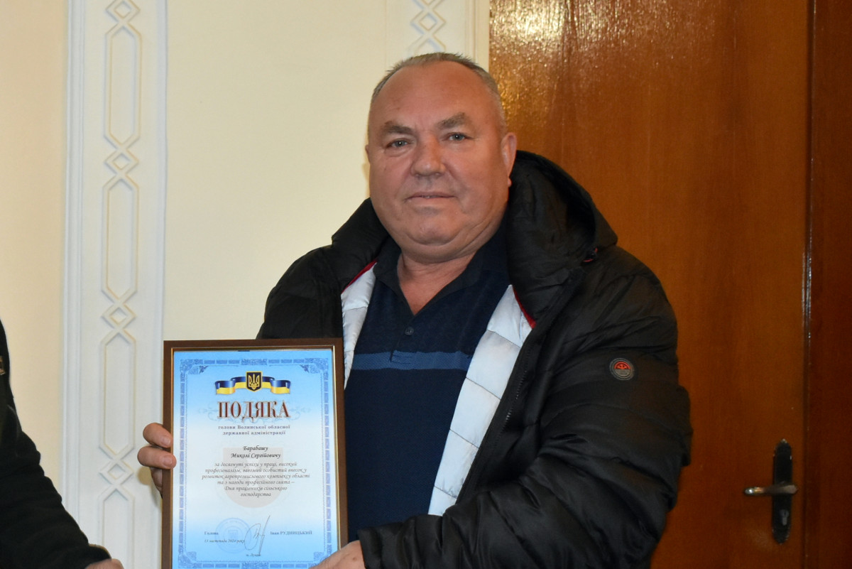 Потому відбулося нагородження працівників сільського господарства Волині. Зокрема, за досягнуті успіхи у праці, високий професіоналізм, вагомий особистий внесок у розвиток агропромислового комплексу області та з нагоди професійного свята – Дня працівників сільського господарства – нагороджено Почесною грамотою обласної державної адміністрації: