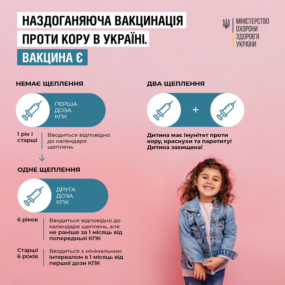 Згідно з Календарем профілактичних щеплень в 12 місяців проводять перше щеплення від кору, а в 6 років — планову ревакцинацію. Ці дві дози вакцини забезпечують захист дитини від кору, паротиту та краснухи.