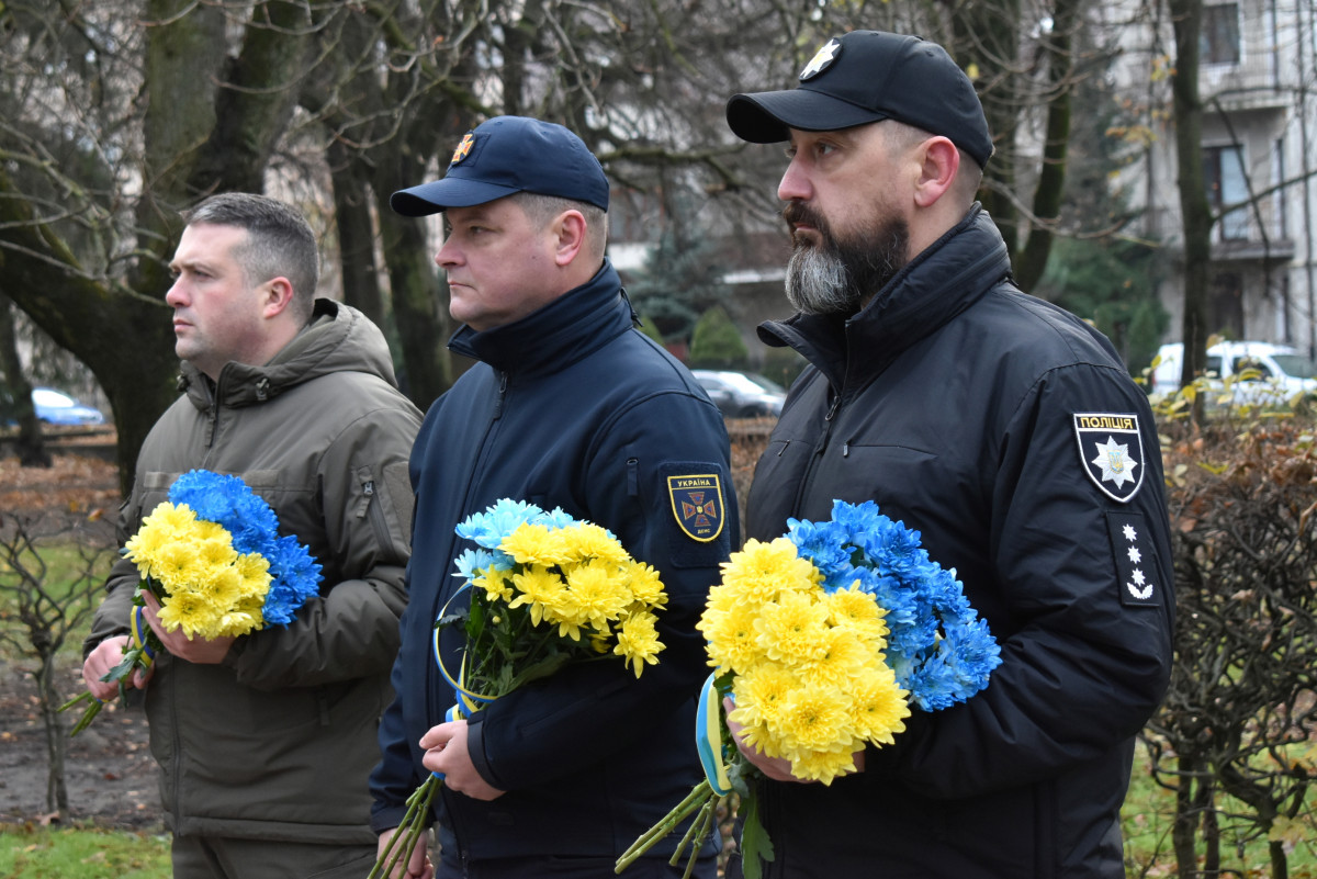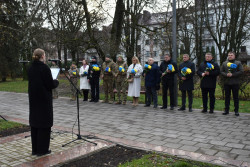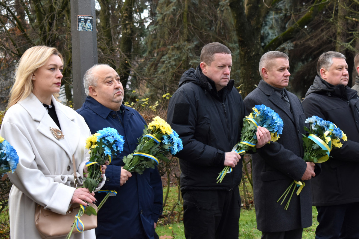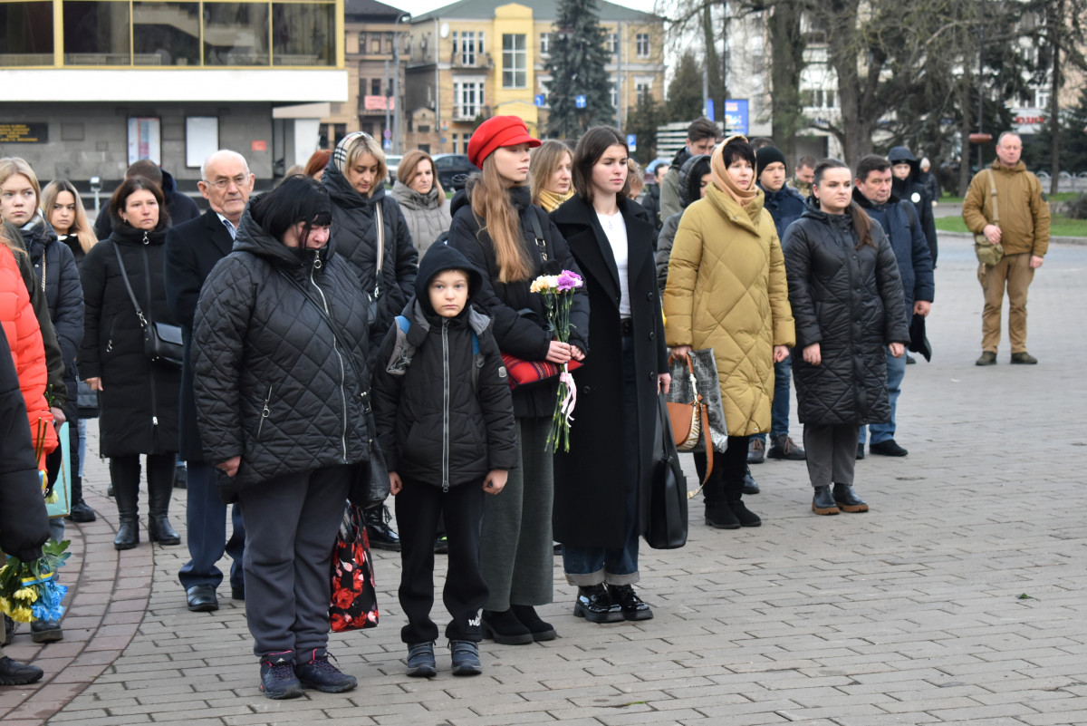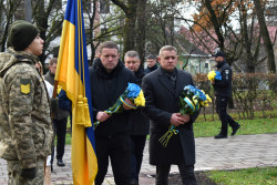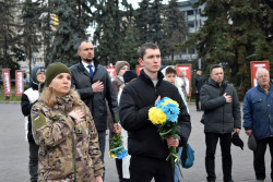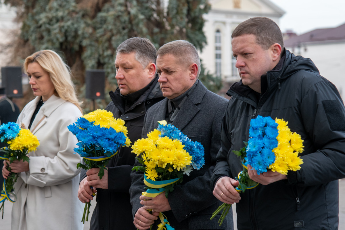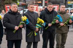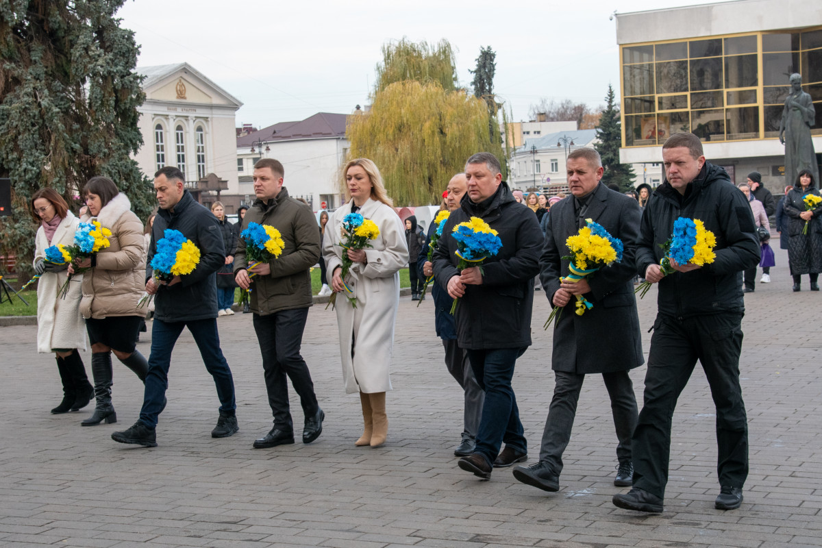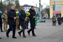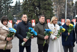 Символічні синьо-жовті квіти поклали до фотостенду Героїв Небесної Сотні волиняни, серед них начальник обласної військової адміністрації Іван Рудницький, представники обласної та міської ради, Луцької районної адміністрації, військові і правоохоронці, громадські активісти.