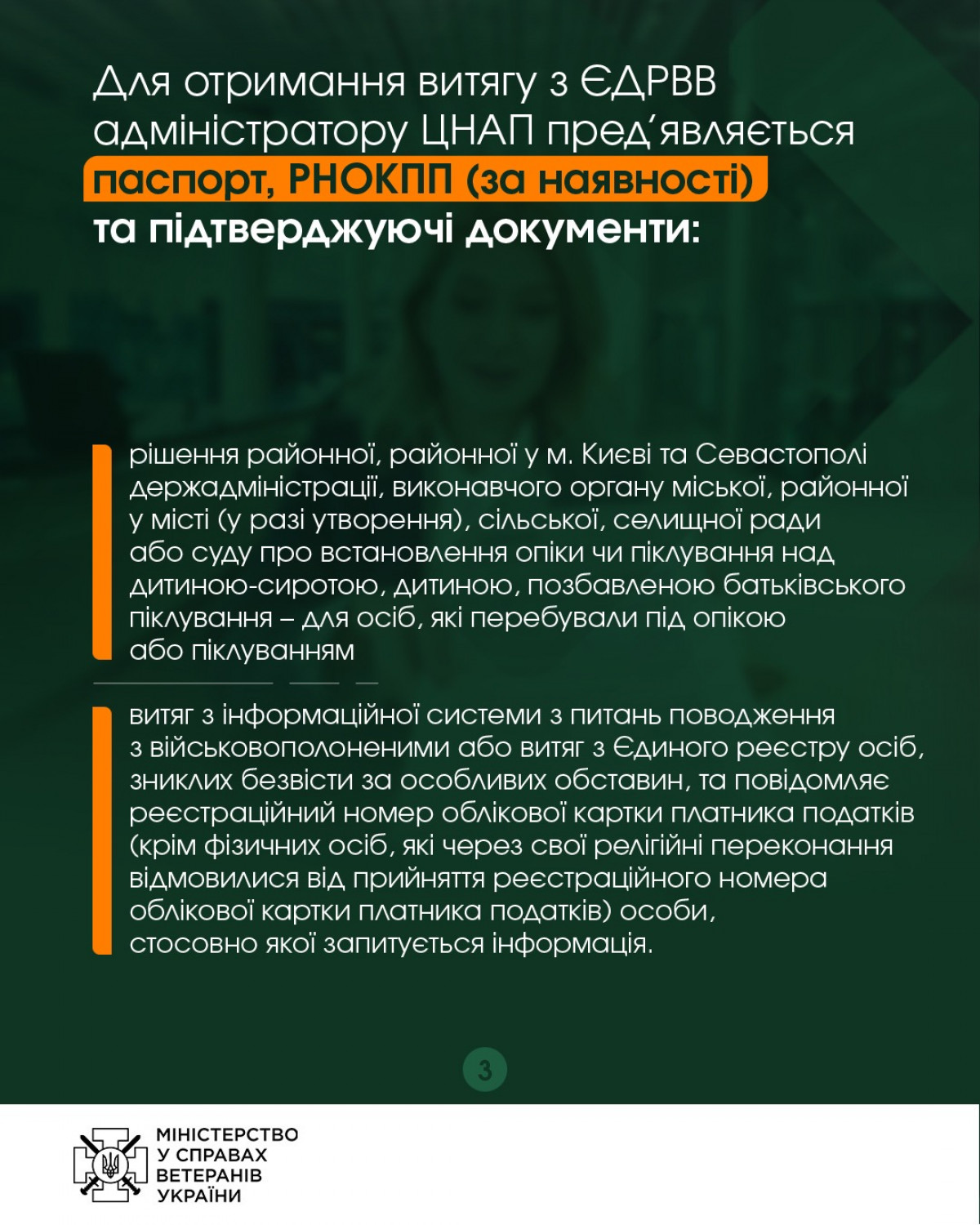 Нагадаємо, із 2 січня 2025 року цифровізовано послугу отримання витягу із Єдиного державного реєстру ветеранів війни у Центрах надання адміністративних послуг (ЦНАП): https://mva.gov.ua/prescenter/category/86-novini/vityag-iz-edinogo-derzhavnogo-reestru-veteraniv-viyni-vidteper-mozhna-otrimati-v-tsnap-za-5-hvilin