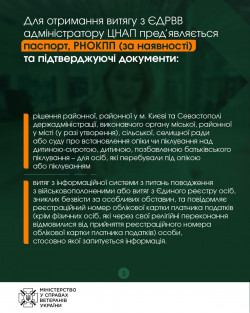 - витяг з інформаційної системи з питань поводження з військовополоненими або витяг з Єдиного реєстру осіб, зниклих безвісти за особливих обставин, та повідомляє реєстраційний номер облікової картки платника податків (крім фізичних осіб, які через свої релігійні переконання відмовилися від прийняття реєстраційного номера облікової картки платника податків) особи, стосовно якої запитується інформація.