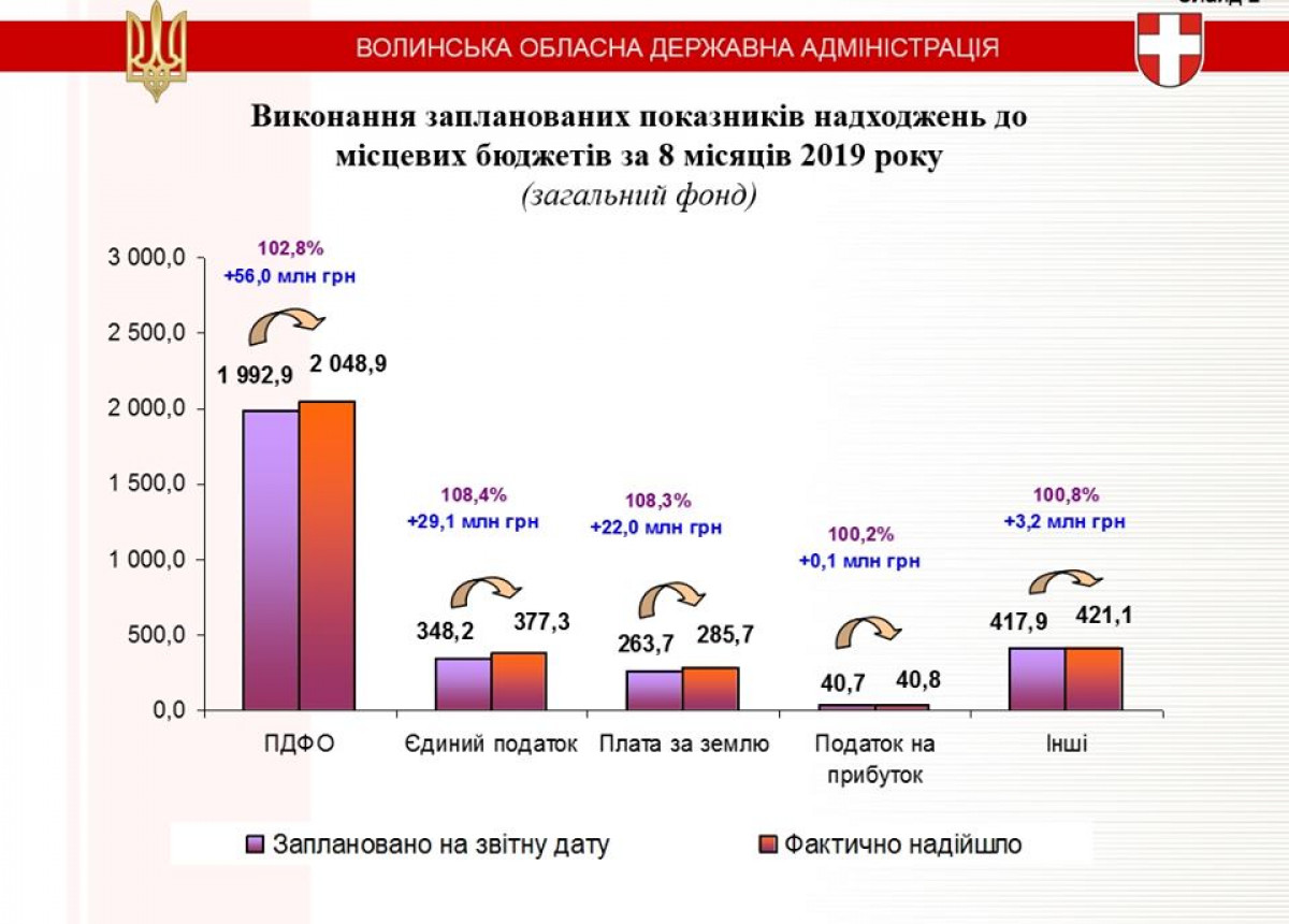 - До загального фонду місцевих бюджетів області надійшло майже 3,2 млрд грн власних доходів, або 103,6 відсотка до запланованого. Обласний бюджет виконаний на 101,6 відсотка, понад план надійшло 7,4 млн гривень. Порівняно із відповідним періодом минулого року надходження зросли 18 відсотків. Понад 20 відсотків досягнуто приросту основних бюджетоутворюючих платежів. Зокрема із податку доходів фізичних осіб, плати за землю і єдиного податку, - поінформував Ігор Миколайович.