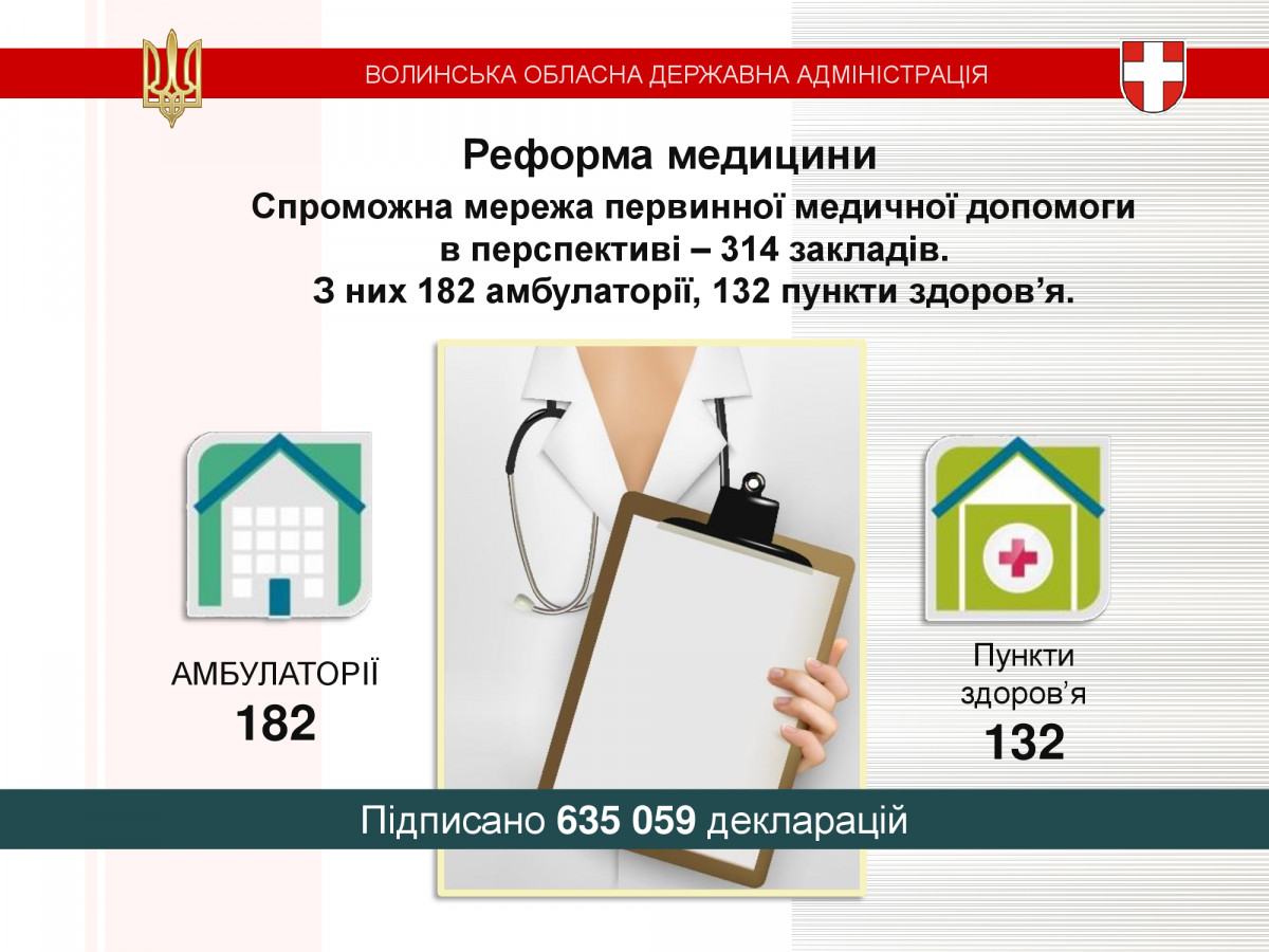 Реформа медичної галузі включає в себе заходи із формування спроможної мережі первинної медичної допомоги. Відповідно до структури сформованої мережі первинної медичної допомоги в області буде функціонувати 314 закладів первинної медичної допомоги, в тому числі: 182 амбулаторії, 132 пункти здоров'я. Станом на 26 листопада в області підписано 635 тис 59 декларацій або 61,3% від кількості населення в області.