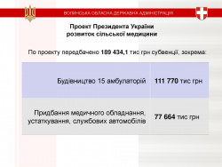 Постановою Кабінету Міністрів України цьогоріч для області виділена цільова медична субвенція у сумі 189,4 млн гривень, яка спрямовується на будівництво та капітальний ремонт 15 амбулаторій, придбання 130 службових автомобілів та медичного обладнання. Ці кошти – масштабний проект Президента України Петра Порошенка «Розвиток сільської медицини». Про це повідомив голова обласної державної адміністрації Олександр Савченко під час засідання Ради Регіонального Розвитку Волинської області. Захід відбувся сьогодні, 29 листопада 2018 року.