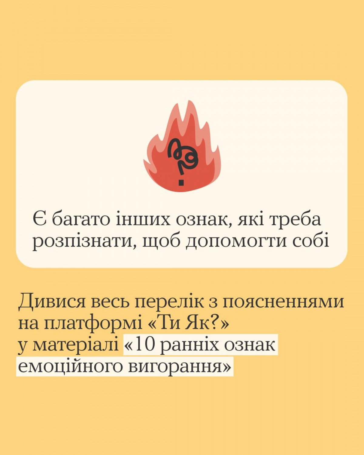 Більше про те, який може мати вигляд емоційне вигорання, розповіли в матеріалі на платформі «Ти як?»: https://surl.li/blxpov.