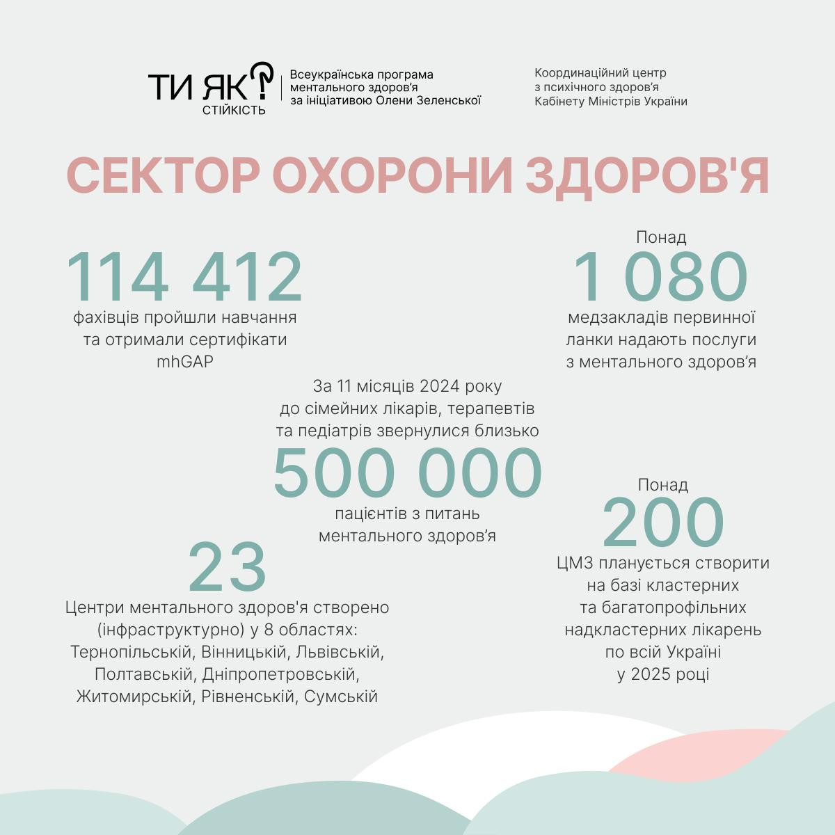Сімейні лікарі, терапевти, педіатри. Попри пов’язані з війною виклики 114 тисяч фахівців пройшли навчання з ментальної допомоги. І отримали вже маже 500 тисяч звернень (найчастіші скарги пацієнтів – відчуття тривоги, напруженості, проблеми зі сном).