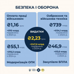 Пріоритетом №1 залишається безпека та оборона. Всі кошти українських платників податків підуть виключно на забезпечення Сил безпеки й оборони, на виготовлення та закупівлю нової зброї, дронів та техніки. На це передбачено 2,23 трлн грн.