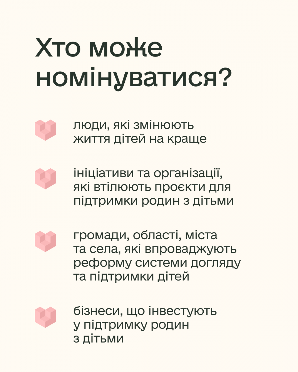 В Україні вперше відзначатимуть лідерів змін у сфері захисту прав дитини, підтримки родин та інклюзії. Кожна дитина має право жити у сімейному колі, де про неї дбають. І щодня тисячі людей, громад та бізнесів наближають цю мету, створюючи кращі умови для життя дітей.