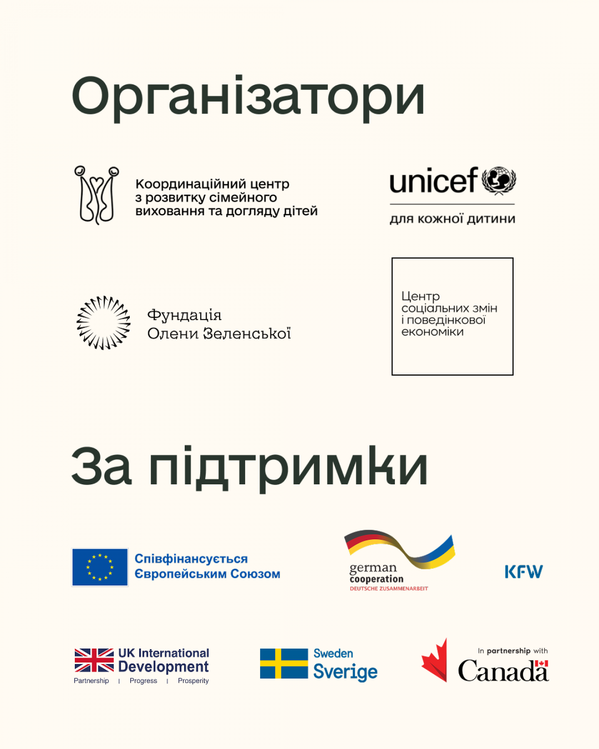 Ініціатива реалізується Координаційним центром з розвитку сімейного виховання та догляду дітей у партнерстві з ЮНІСЕФ, Фундацією Олени Зеленської, Центром соціальних змін і поведінкової економіки за фінансової підтримки ЄС, урядів Канади, Швеції, Великої Британії та Німеччини.