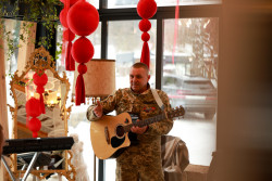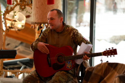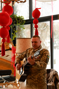 Музикою наповнив зал ветеран Сергій Поліщук, який виконав повстанську пісню «Повіяв вітер степовий». У перший день повномасштабної війни Сергій Юхимович пішов добровольцем. Навіть між чергуваннями і тривогами музика стала його власним способом тримати внутрішню рівновагу.