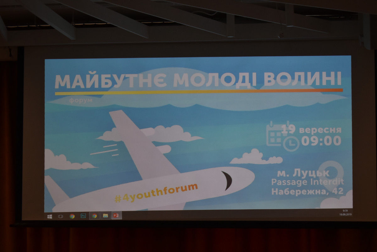 У Луцьку за ініціативи Молодіжної ради, що діє при обласній державній адміністрації, організували форум «Майбутнє молоді Волині». Захід триватиме протягом четверга, 19 вересня 2019 року. Основною метою дійства є вдосконалення та розробка правок до обласної молодіжної програми. Для цього з усього регіону завітали активні молоді люди. Долучилися до заходу й представники обласної влади. Зокрема, заступниця голови обласної державної адміністрації Світлана Мишковець та начальниця управління освіти, науки й молоді облдержадміністрації Людмила Плахотна.