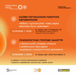 У п’ятницю, 13 вересня, у конференц-залі ЦНАПу Луцької міської ради заплановано сьоме регіональне публічне обговорення «Війна і суспільство: чому зараз важливо бути чуйними».